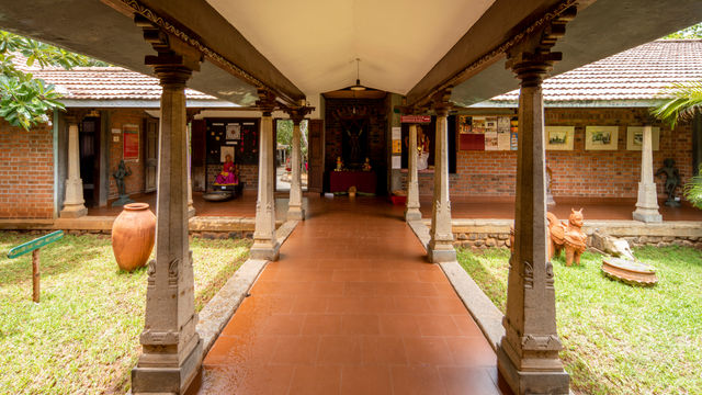 A long drive from the entrance, lined by lush native plants and trees, ends at the magnificent view of the building that houses the reception centre and craft shop. The character of the reception and craft shop blends cultures from south India. The green signboards indicate the location of the reception and other nearby buildings. Posters of the upcoming cultural events are displayed on boards next to the entrance. A couple of steps from the drop-off point lead to the entrance to the reception. The vast central courtyard garden that adorns beautiful terracotta sculptures that can be seen peeking through the intricately carved doors of the building. It facilitates ample light and ventilation in the building.