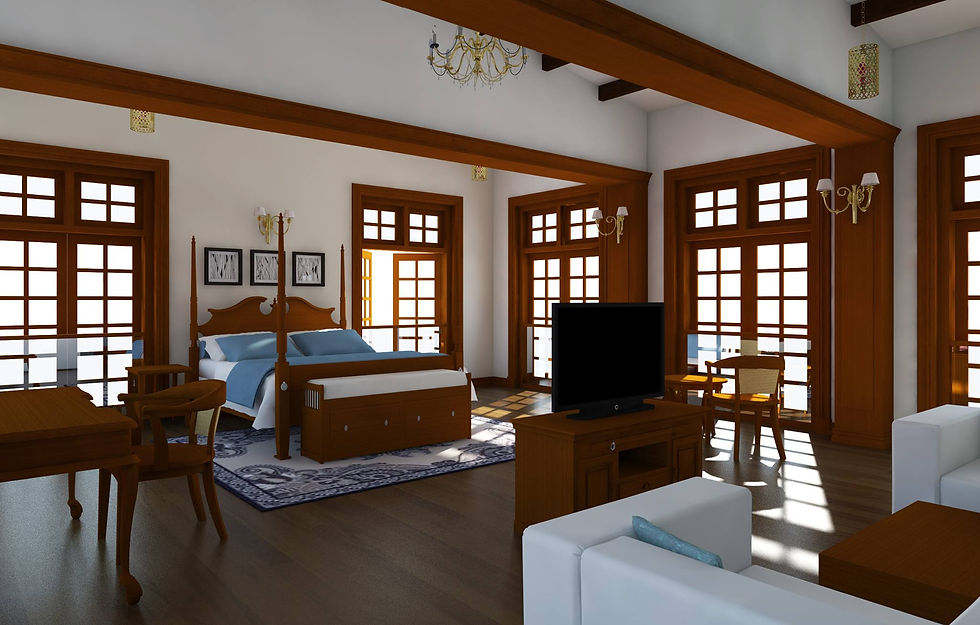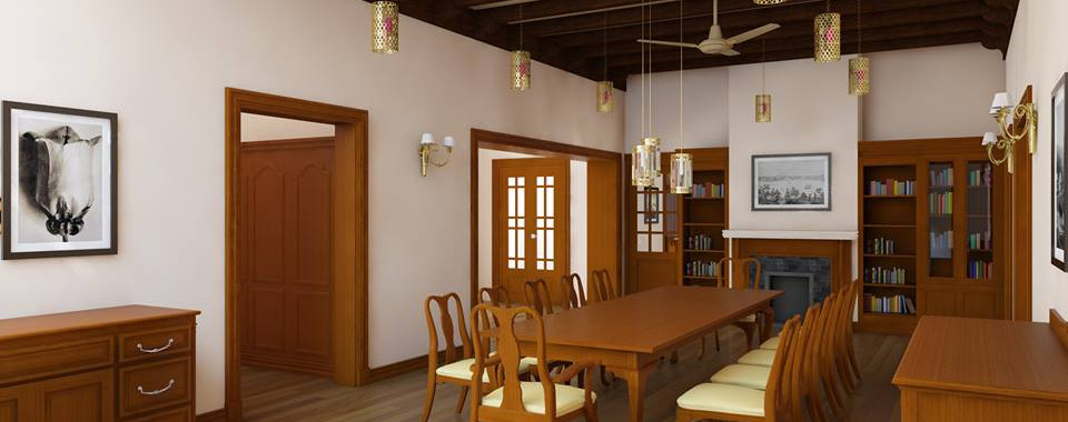 Terracotta flooring, ornate furniture and lighting, usage of natural materials, elaborate and extensive usage of timber in ceilings, beams, door architraves, wall panels, chimneys – were also designed and infused into the existing interiors – which contributes towards bringing back the identity of the bungalow.